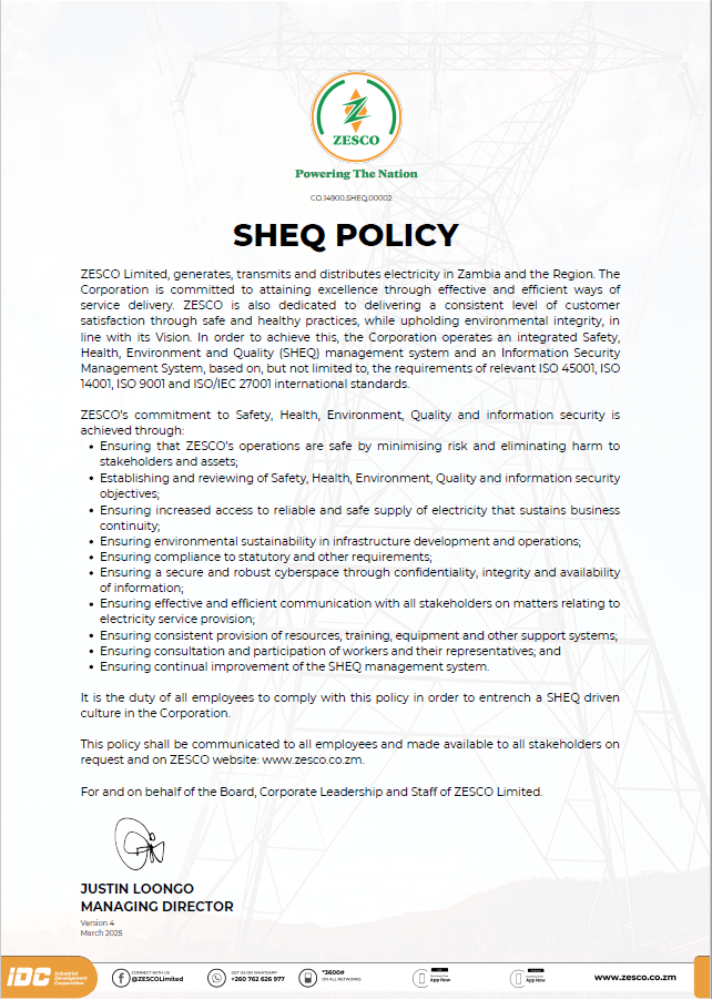 ZESCO Limited is a Zambian national power utility that is owned by the Government of the Republic of Zambia. Its mandate is to supply electricity and energy solutions within Zambia and the Sub Saharan region.